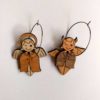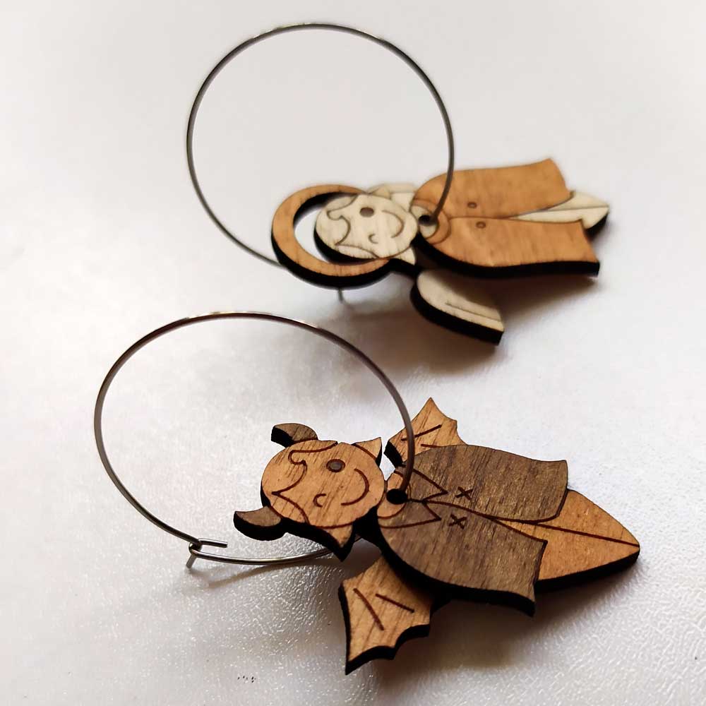 L’ensemble des perles en bois mesure environ 4,2cm de hauteur et 3,5cm de large, au niveau des ailes. Elles sont montées sur des boucles d’oreilles créoles en inox de 30mm de diamètre. L’inox est un matériau à la fois inoxydable (ne noircit pas) et non allergène (pas d’irritations). Réalisées en bois de bouleau à la fois très fin et très solide (contreplaqué habituellement utilisé pour les maquettes de bateau ou avion), ces boucles sont très légères et se feront complètement oublier.