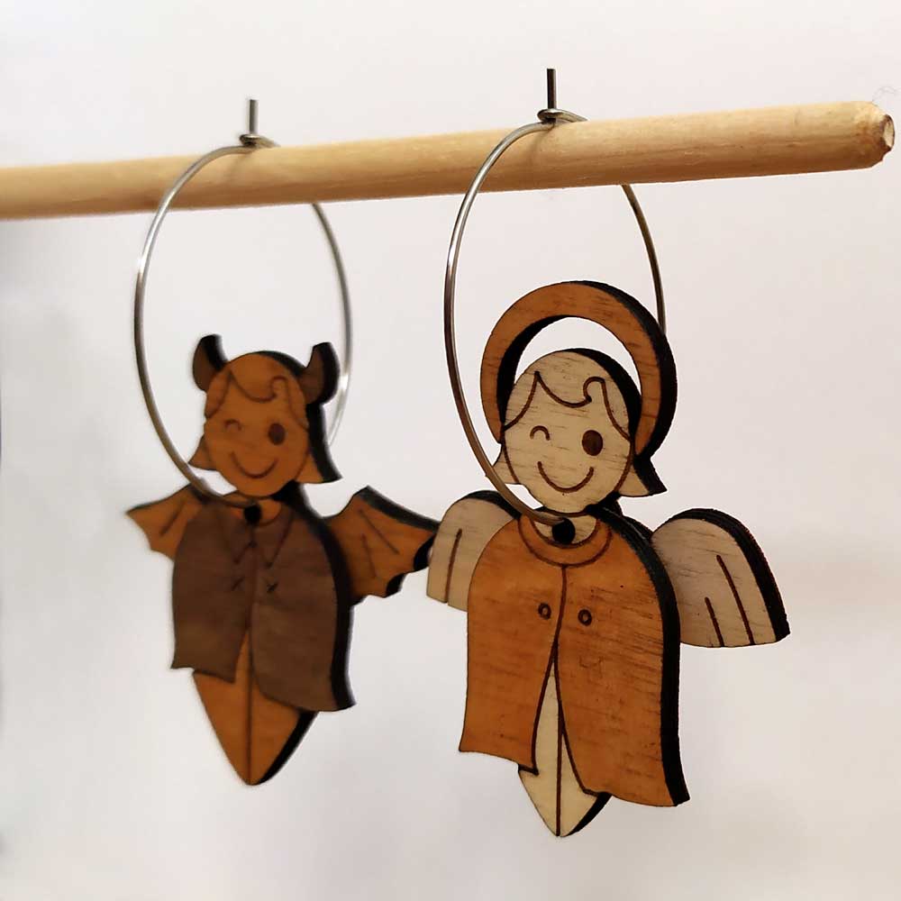 Paire de boucles d’oreilles dépareillée, constituée d’un ange et d’un démon (ou diablotin). Originales et rigolotes, ces boucles d’oreilles ange et démon ne passent pas inaperçues ! Les ailes des personnages ne sont pas collées aux corps mais simplement enfilées sur la boucle en inox. Les personnages semblent ainsi animés : leurs ailes bougent à chacun de vos mouvements.