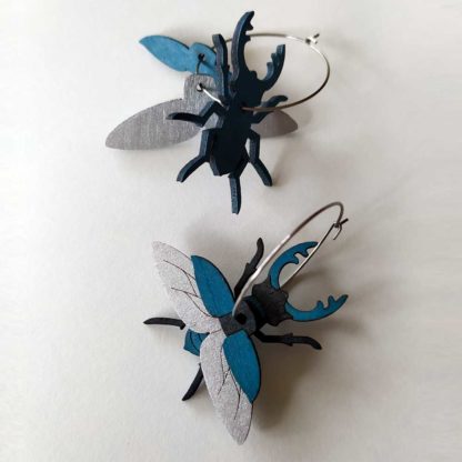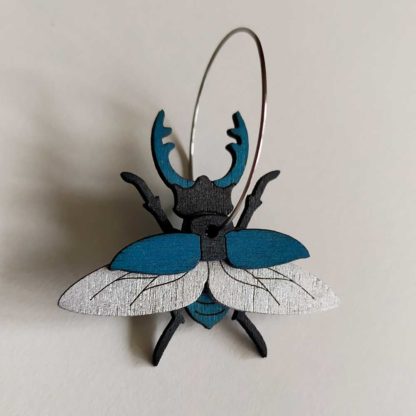 Superbes boucles d’oreilles insecte en bois, peintes à la main. Les ailes du Lucane sont argentées et pailletées et contrastent avec le corps de l’insecte peint en bleu et noir. Le Lucane est constitué de trois perles en bois qui ne sont pas collées entre elles : le corps et les pattes, les ailes et les élytres. Les mouvements de votre tête feront bouger chaque perle de façon isolée, donnant ainsi l’impression que le Lucane est en train de s’envoler !