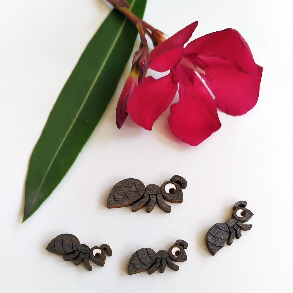 La plus grande fourmi mesure 2,7 x 1,3 cm, les trois petites mesurent 2 x 1 cm. Les fourmis sont fabriquées dans du bois de peuplier de 3mm d’épaisseur. Elles sont peintes d’un gris légèrement pailleté, qui reflète la lumière et rappele l’aspect brillant des vraies fourmis !