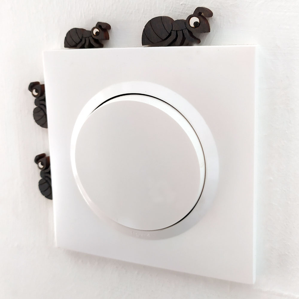 Originale et drôle, cette décoration se place au-dessus d’un interrupteur, le long d’un montant de porte ou d’un meuble. Une famille de fourmis, en bois, peintes à la main, que vous pouvez sans crainte laisser s’installer dans votre maison !