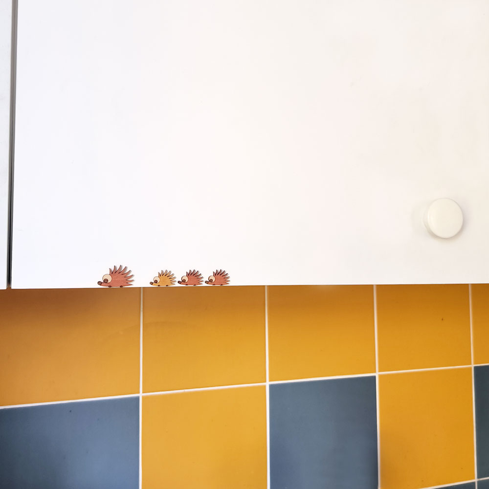 Décoration originale et amusante pour égayer un interrupteur, un montant de porte ou un meuble, placard. Une famille de hérissons, en bois, peints à la main, qui amuseront les familles et les invités !